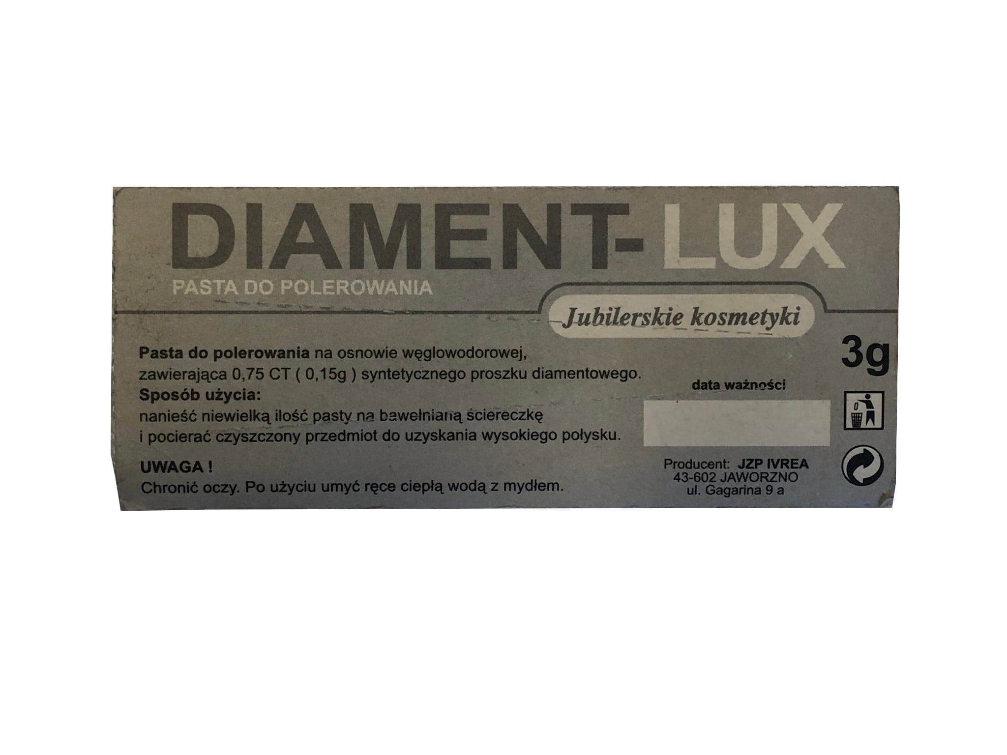 - Pasta do polerowania na osnowie węglowodorowej, zawierająca 0,75 CT (0,15g) syntetycznego proszku diamentowego.