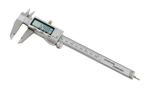 Suwmiarka elektroniczna (w metalowej obudowie wyświetlacza).