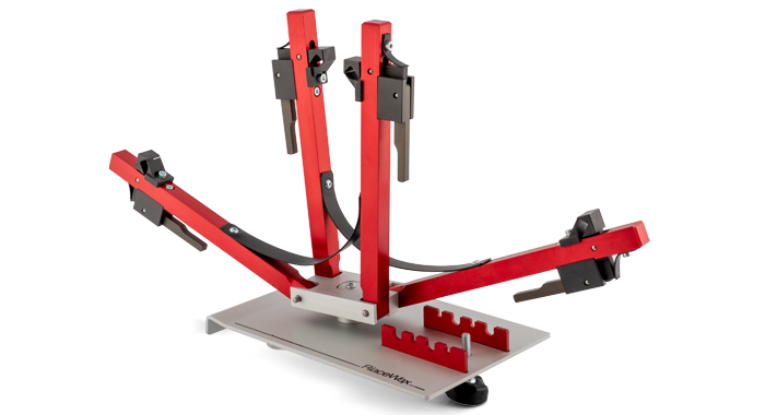 Sprężyna trzyma formę zawsze otwartą, bez konieczności użycia rąk, oznacza to mniej wysiłku, większą szybkość i dobrą widoczność podczas cięcia. Uchwyt zamocowany jest na obrotowej platformie.