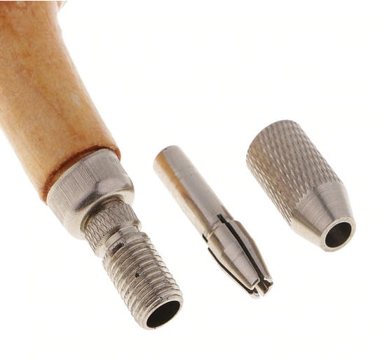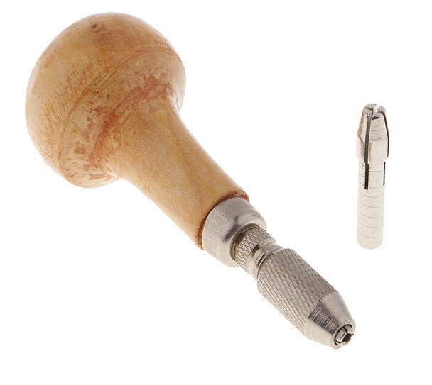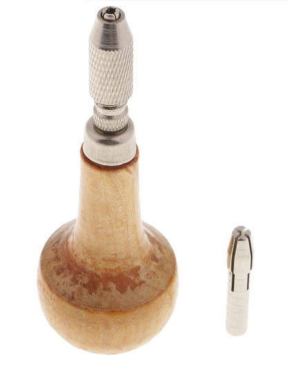 Uchwyt uniwersalny. Rękojeść drewniana, z dwiema wymiennymi szczękami zaciskowymi do mocowania m.in. wierteł, miligryfów, rylców.
