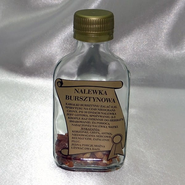 Przygotowanie nalewki: zalej bryłki bursztynu 95% spirytusem. Odstaw na 10 dni w ciepłe i zacienione miejsce. Po tym czasie nalewka będzie gotowa do spożycia, a bursztyn powinien zabarwić spirytus na złocistobrązowy kolor. Nalewkę można odcedzić, a bursztyn zalać ponownie. Po drugim użyciu bryłki bursztynu można wykorzystać raz jeszcze i posypać nim świece, by zjonizować powietrze w mieszkaniu.