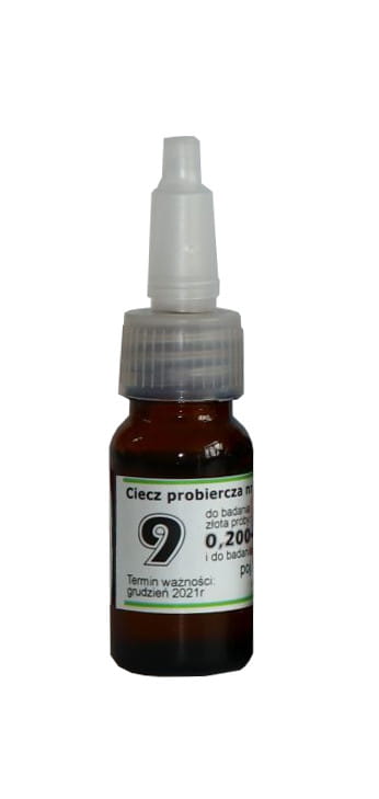 Ciecz probiercza nr1 9, służy do badania złota próby 0,200-400 i do badania srebra na kamieniu probierczym (przy użyciu iglic probierczych).