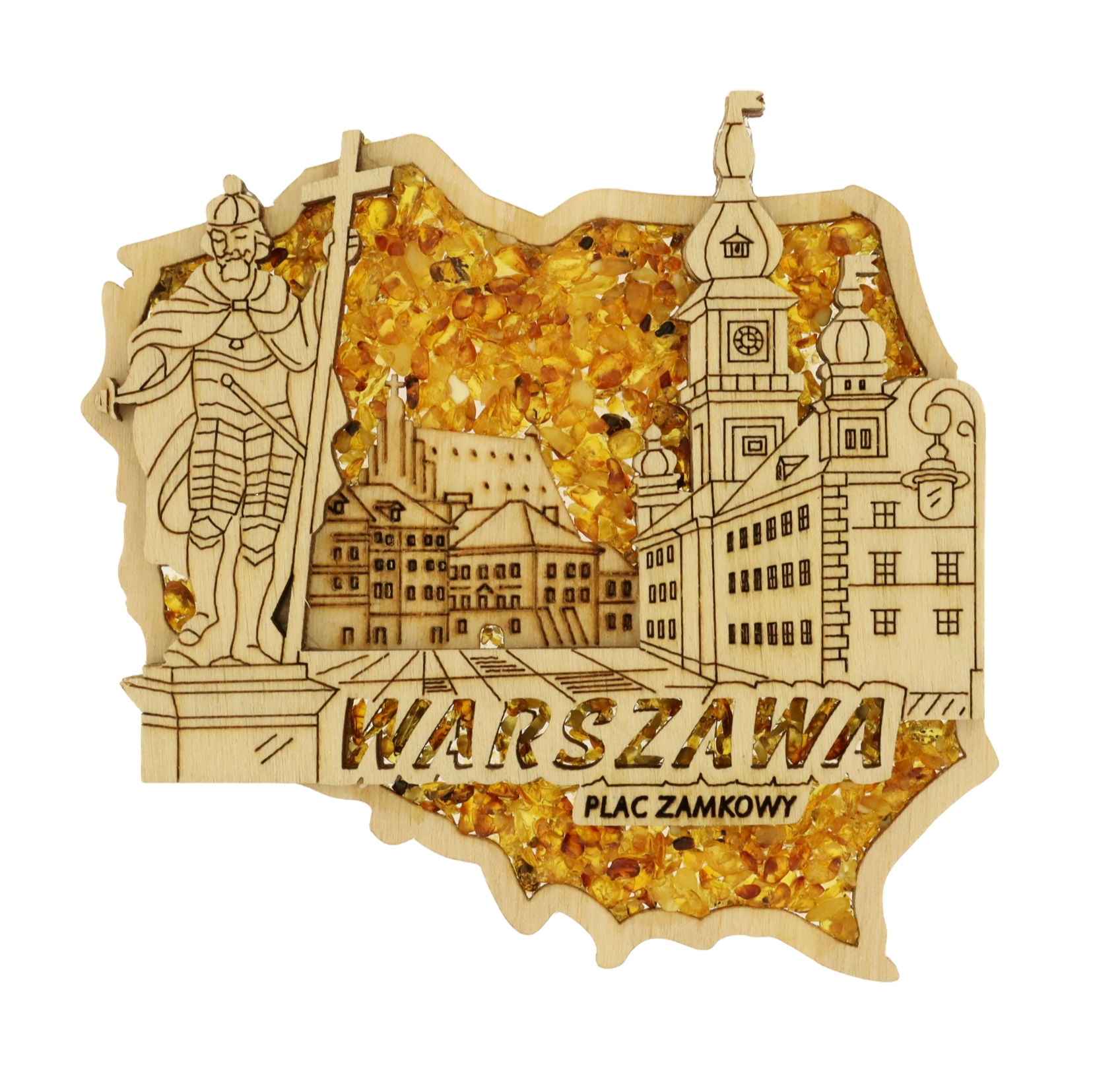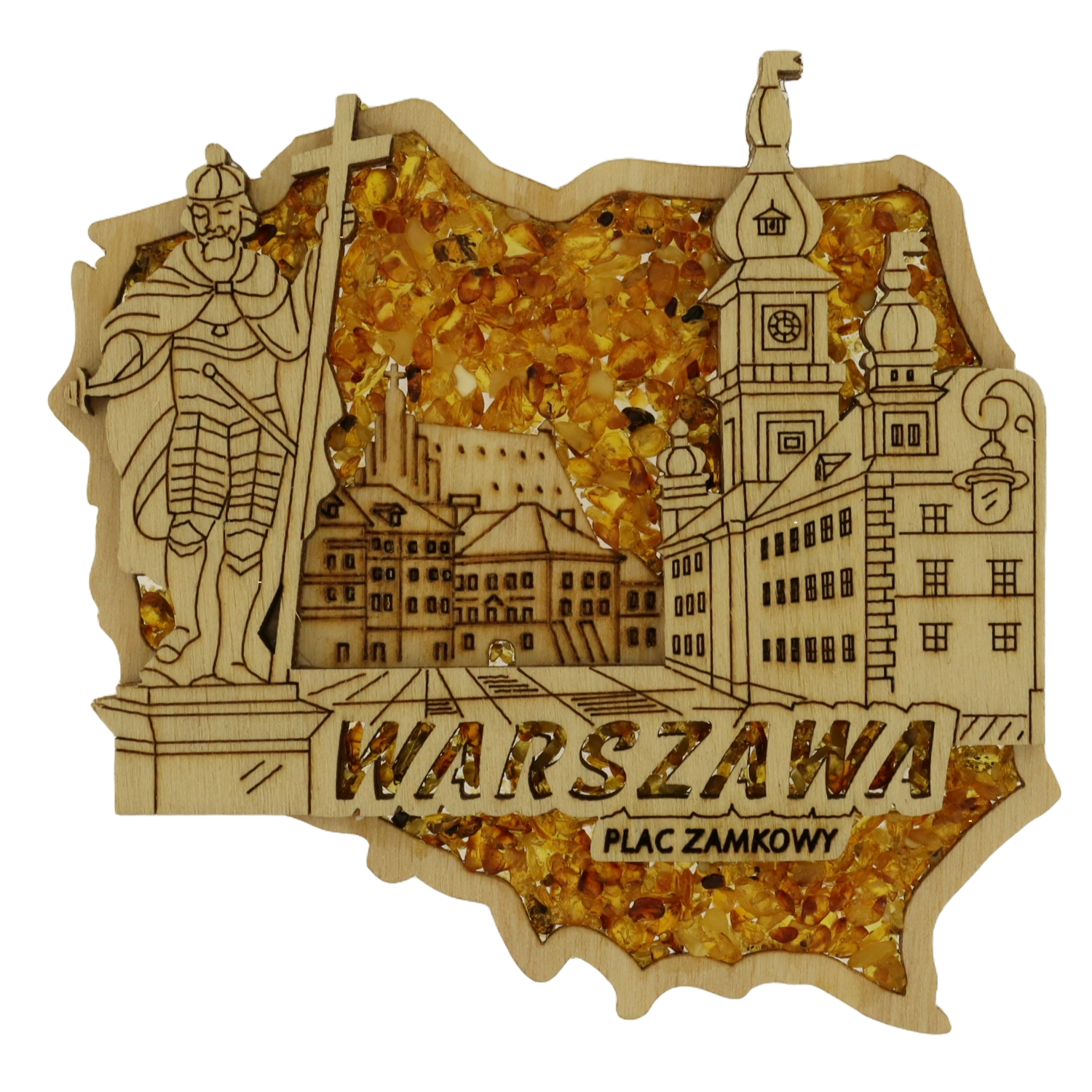 Magnes ze sklejki drewnianej z wypalanym laserowo z motywem Placu Zamkowego z bursztynem