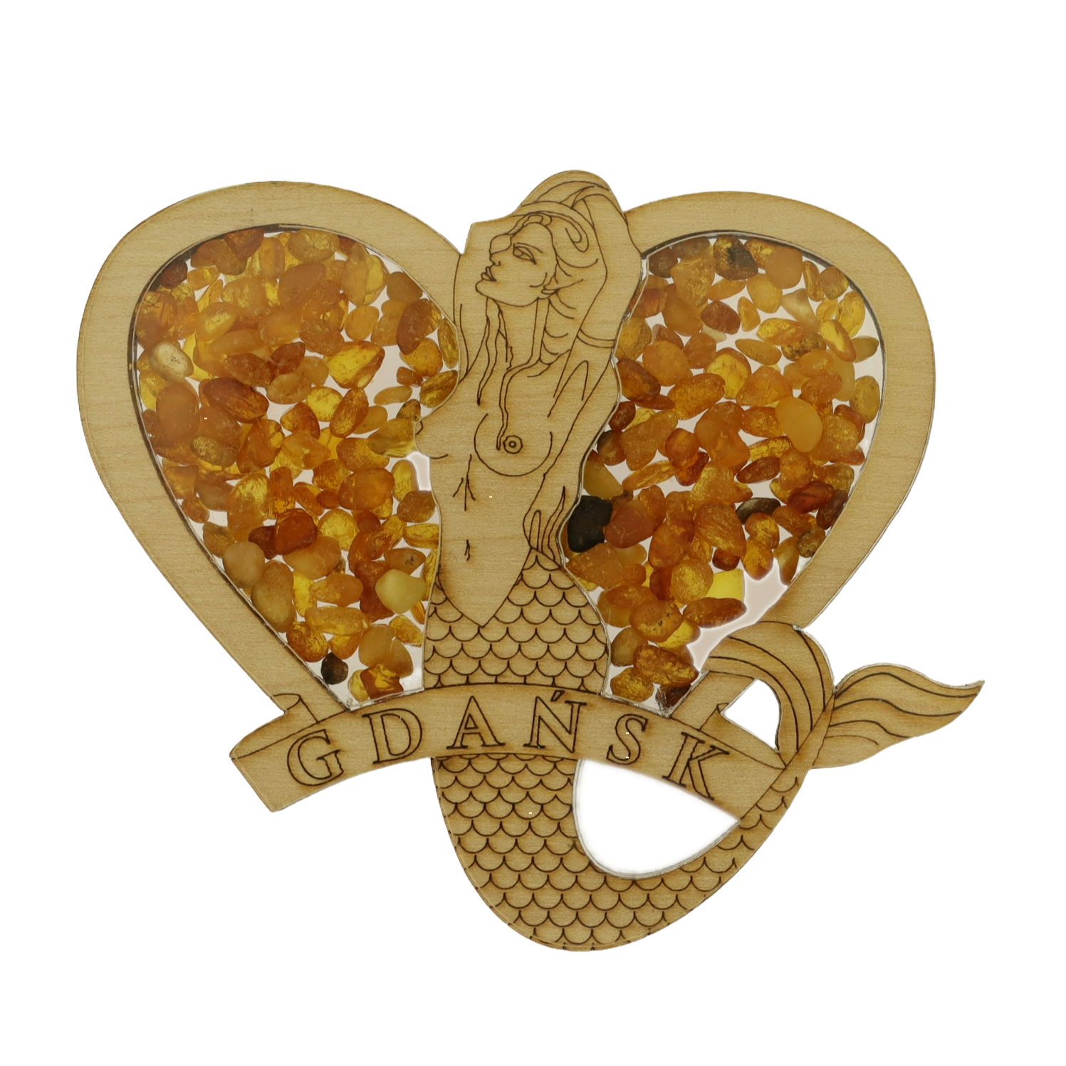 Magnes ze sklejki drewnianej z wypalanym laserowo wzorem syrenki.