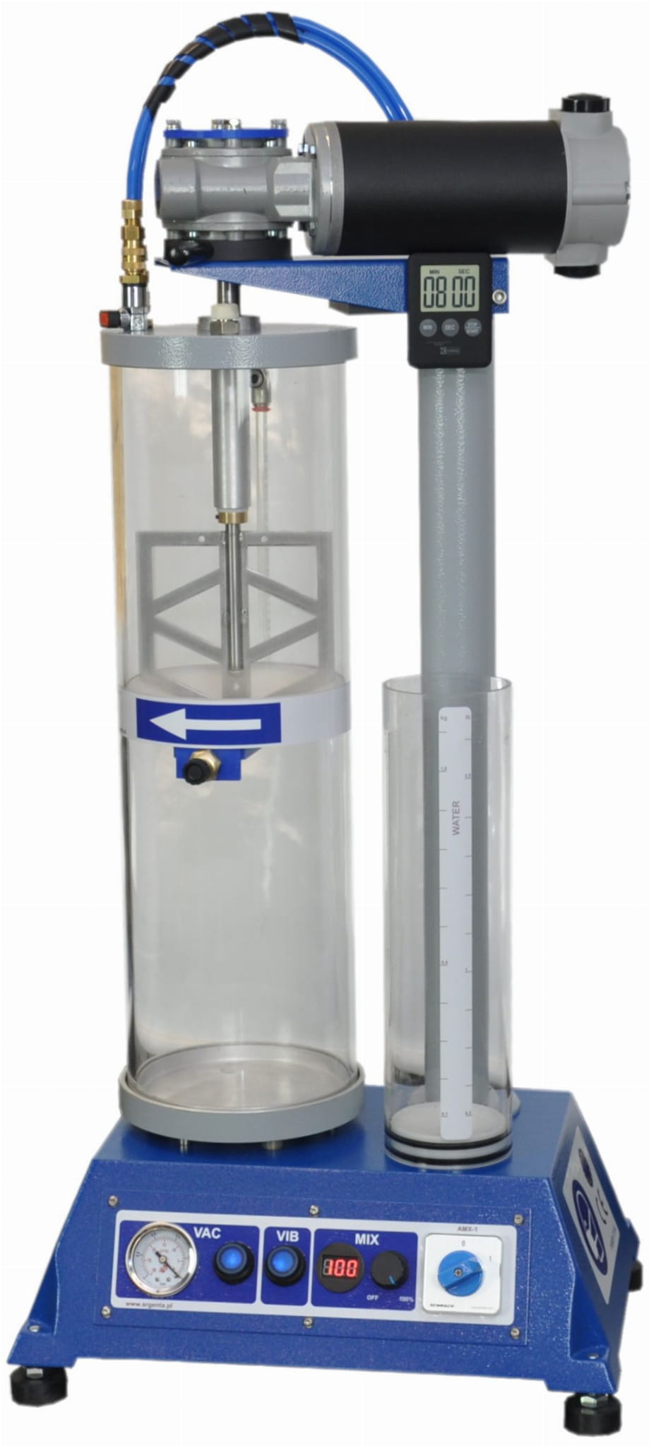Mieszalnik mas odlewniczych stosowanych jest w procesie odlewania biżuterii metodą na wosk tracony. Urządzenie pozwala wymieszać masę i zalać kuwetę w atmosferze kontrolowanej próżni oraz wibracji znacznie przyspieszających uwalnianie pęcherzy powietrza. Prędkość obrotowa mieszadła jest dostosowywana według potrzeb, a jego aktualną prędkość wskazuje wbudowany wyświetlacz LED. Czas mieszania kontrolowany jest przez elektroniczny timer, który upłyniecie ustawionego czasu sygnalizuje alarmem dźwiękowym. Urządzenie wyposażone jest w system automatycznego podawania odmierzonej wody do mieszaniny. Cały proces jest dobrze widoczny dzięki przeźroczystej konstrukcji urządzenia. Sterowanie pompą próżniową wykonywane jest z poziomu przycisków na pulpicie, a wartość próżni wskazuje wbudowany wakuometr. Mycie urządzenia po skończonym zalewaniu ogranicza się jedynie do opłukania zbiornika pod bieżącą wodą, co znacząco skraca i ułatwia obsługę. Zestaw nie zawiera pompy próżniowej, która dostarczana jest oddzielnie.