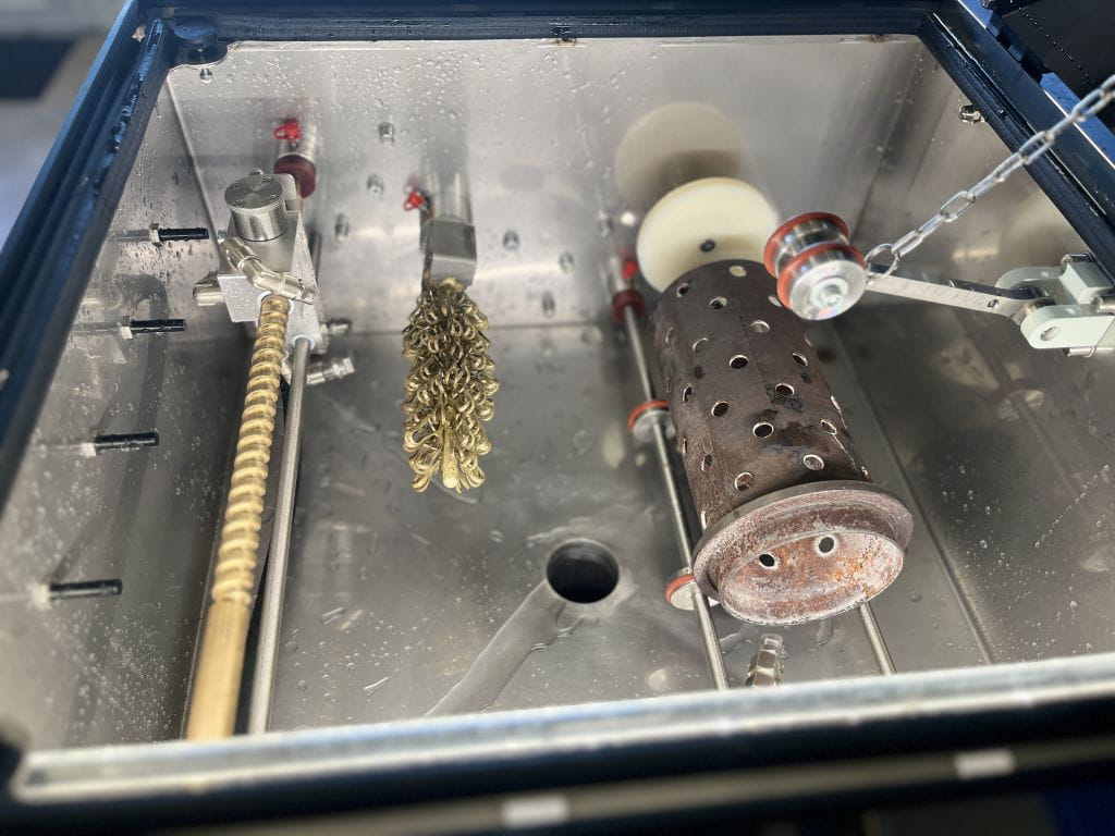 Po umieszczeniu kuwety na rolkach, zamocowaniu choinki w szczękach i naciśnięciu klawisza START automatyczny proces rozpocznie mycie. Choinka i kuweta zaczną się obracać w silnym strumieniu wody, a dodatkowy wózek poruszający się wzdłuż długości choinki zapewni dokładne wypłukanie masy odlewniczej.