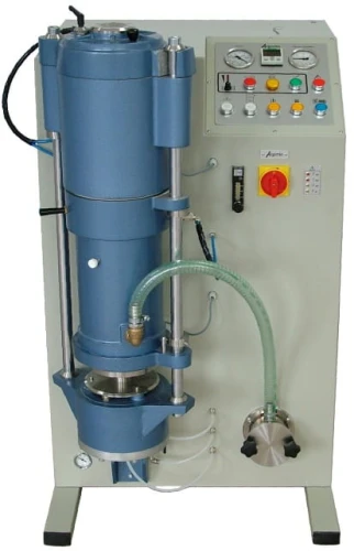 Przebieg całego procesu kontrolowany jest dzięki dużemu i czytelnemu pulpitowi operatorskiemu, zaprojektowane w/g wszelkich prawideł automatyki przemysłowej. Klawisze i kontrolki stanowią czytelny obraz aktualnie wykonywanej funkcji, a wartości procesowych ciśnień wskazywane są na dużych, glicerynowych manometrach.W standardowym wyposażeniu maszyny jest zestaw umożliwiający przeprowadzenie granulacji stopu. Zastosowanie odpowiedniego tygla z "filierem" granulującym umożliwia uzyskanie idealnych kulek o małej średnicy. Uruchomienie odpowiedniej funkcji w maszynie zapewnia cykliczne i kontrolowane upuszczanie roztopionego metalu do pojemnika z cieczą chłodzącą, dzięki czemu uzyskany granulat jest jednolity, bez zamkniętych kropel cieczy w kulce granulatu. Nie generuje to kłopotów z późniejszym odważaniem stopu i jego topieniem.