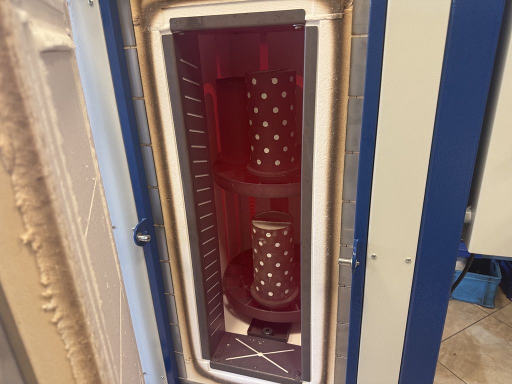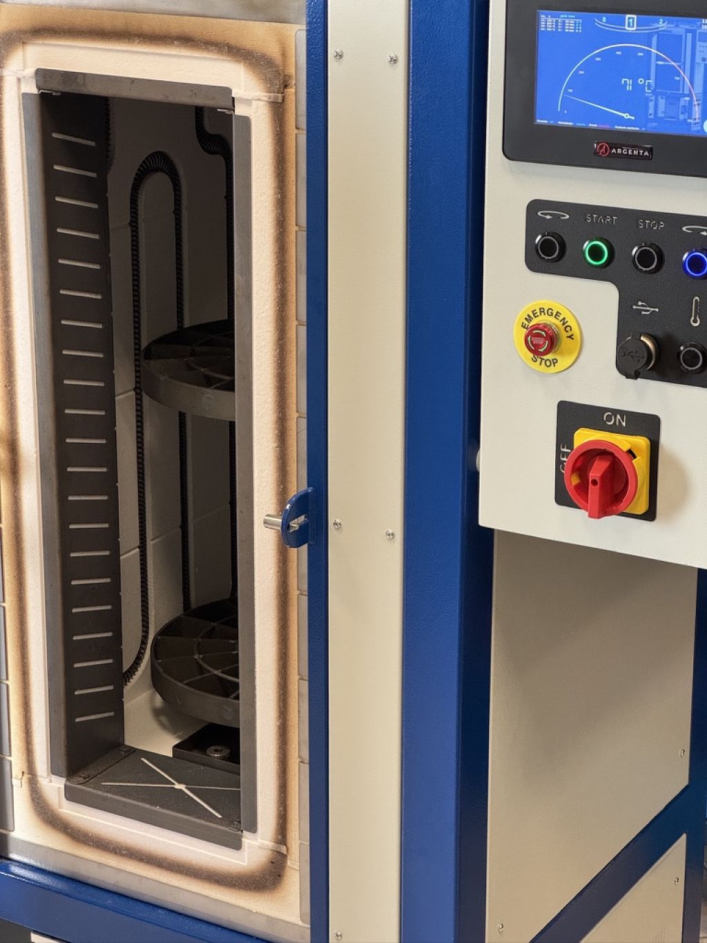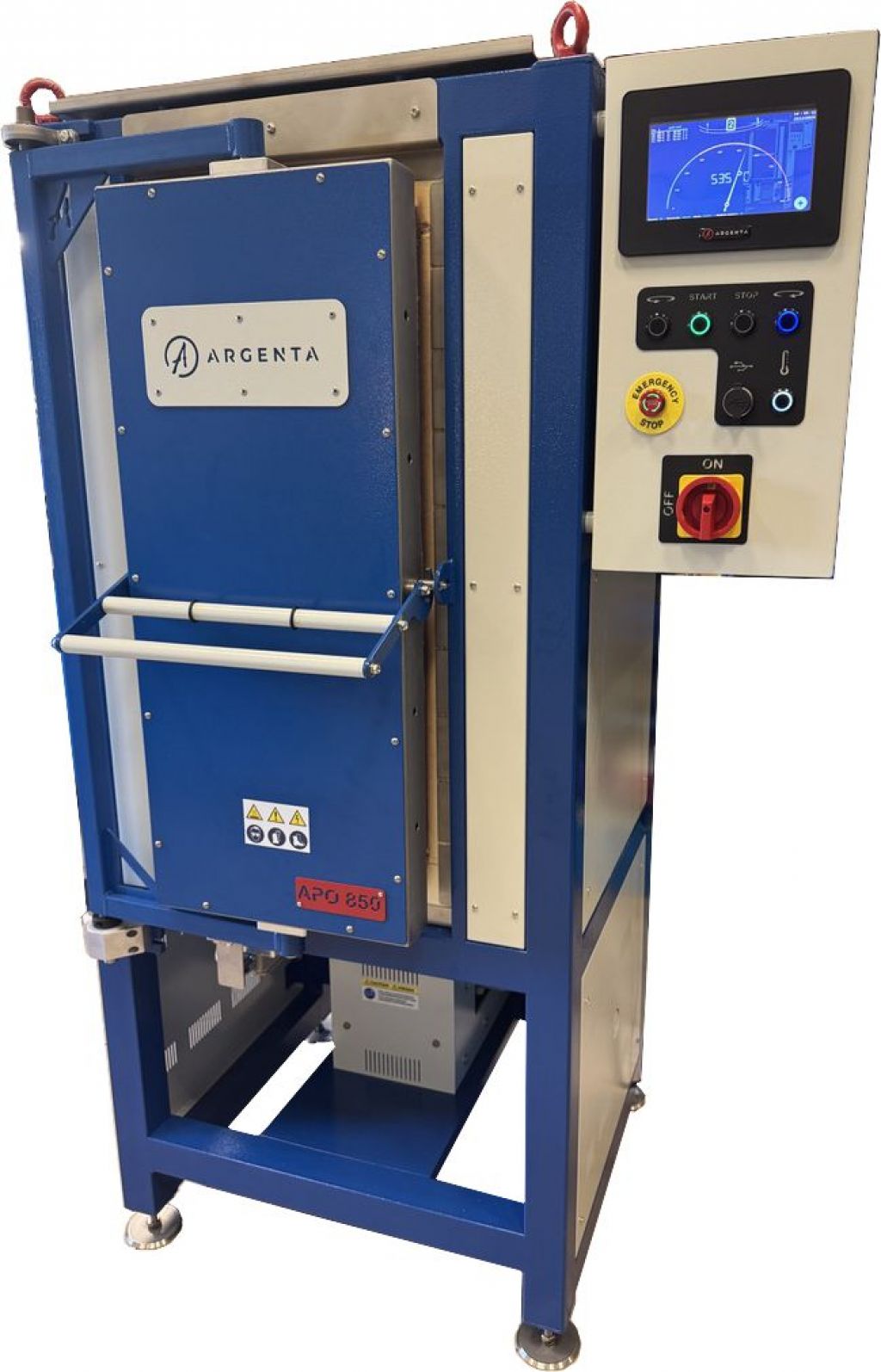 Piec obrotowy APO850/13 został zaprojektowany do wygrzewania kuwet odlewniczych w procesie produkcji biżuterii metodą na wosk tracony. Wyposażony w dwa obrotowe stoły o średnicy 340mm pozwala wygrzewać jednocześnie 13 kuwet odlewniczych o średnicy zewnętrznej 100mm i wysokości maksymalnej 300mm. Obracające się powoli stoły, podczas całego procesu wygrzewania zapewniają równomierny rozkład temperatur oraz nie dopuszczają do miejscowego przegrzania form odlewniczych. Ponadto, pełna kontrola nad obrotowym stołem pozwala „podstawić” aktualnie odlewaną kuwetę pod drzwi, ułatwiając jej szybkie wyjęcie, co skraca czas otwarcia drzwi pieca do minimum, a tym samym ogranicza wystudzanie pieca i pozostałych w nim kuwet. Konstrukcja stołów pozwala na swobodny spływ wytapianego wosku do pojemnika usytuowanego poza piecem. Wosk z górnego stołu kierowany jest w sposób omijający kuwety ustawione na dolnym poziomie.