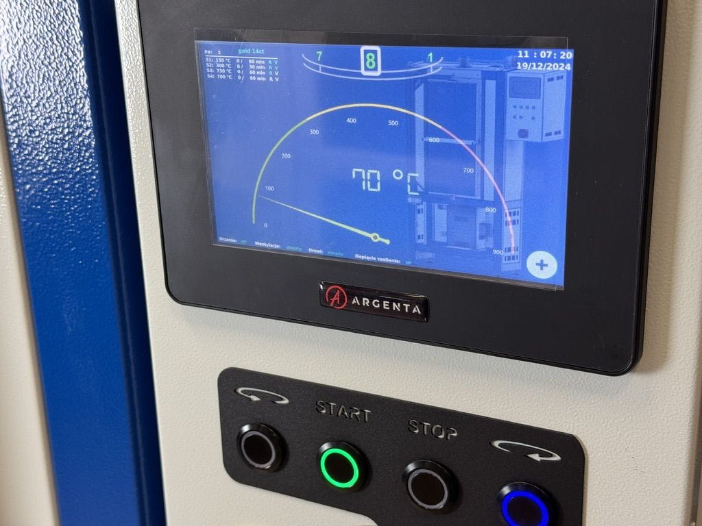 Kontrolę nad piecem sprawuje sterownik PLC z wbudowanym panelem dotykowym o przekątnej 7”. Do jego podstawowych zadań należy: regulacja temperatury, obsługa 33 pamięci programów odlewniczych, kontrola położenia stołu, zapis w historii przebiegu procesu odlewniczego, reakcja na zanik i powrót zasilania po awarii oraz sterowaniem dopalacza spalin (w opcji dodatkowej).