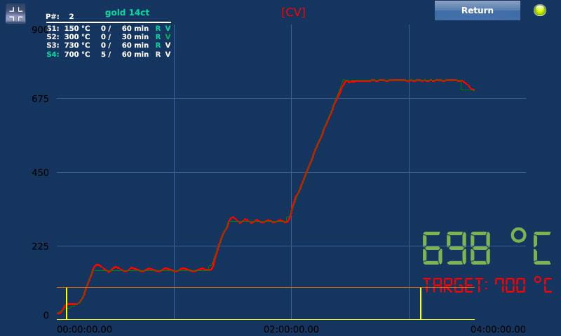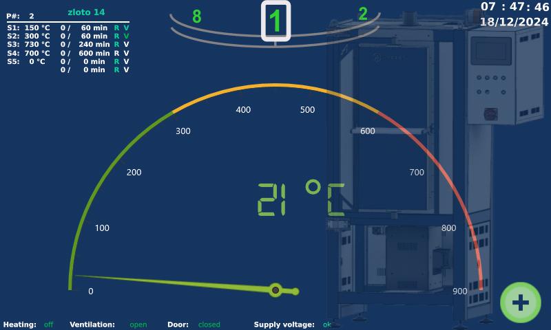 Piec może zostać opcjonalnie wyposażony w dodatkowy, elektrycznie odseparowany od sterownika PLC, regulator temperatury, którego jedynym zadaniem jest nadzorowanie granicznej, bezpiecznej dla kamieni oprawionych na choinkach. W sytuacji, gdy nastąpi nieoczekiwana awaria któregokolwiek z elementów, odpowiedzialnych za nagrzewanie pieca, niezależny regulator odłączy w trybie awaryjnym napięcie zasilające grzałki. Regulator ten posiada swoją niezależną termoparę. Standardowo temperatura odłączenia ustawiana jest na wartości 770 oC, ale może być dowolnie zmieniona. Funkcja kontroli przegrzania jest załączana klawiszem z panelu operatora. Opcja ta jest wręcz niezbędna przy odlewaniu z diamentami.