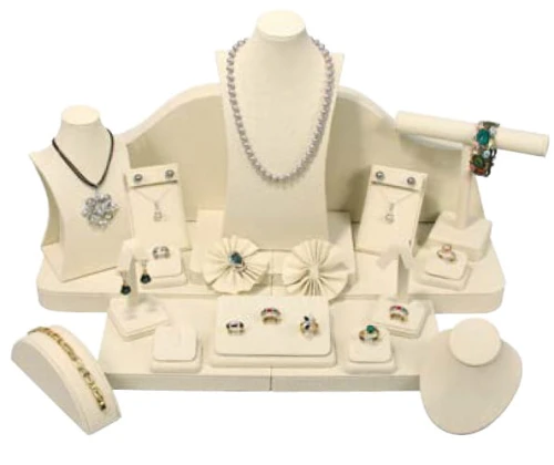 Ikee Design. 24 elementowy beżowy zestaw do prezentowania biżuterii ze sztucznej skóry: z biustem, uchwytem na bransoletę, stojakiem na pierścionki i uchwytem na kolczyki.